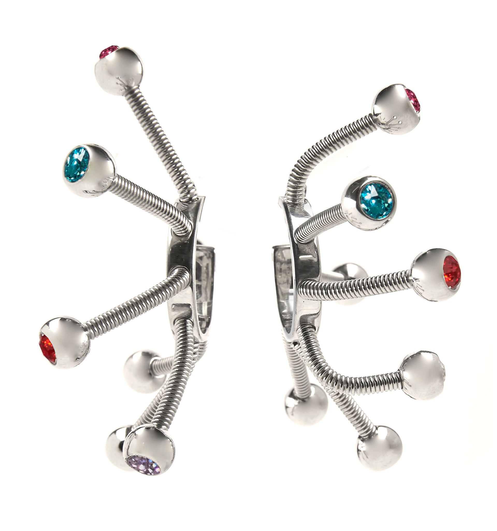 A pair of hoops each featuring 7 flexible chains ending with a ball set with a rhinestone, inspired by the classic banana bell piercing.