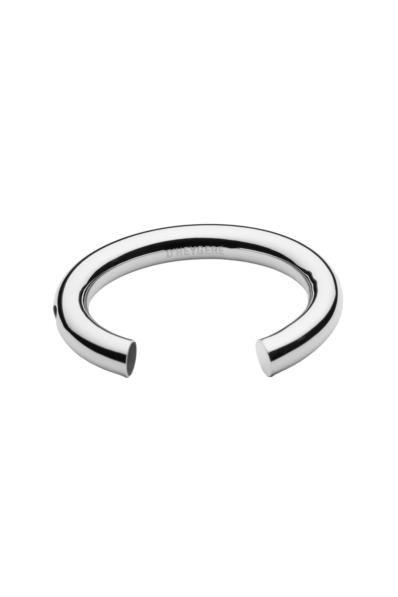 A tubular cuff bracelet featuring two holes to slide a flower through.