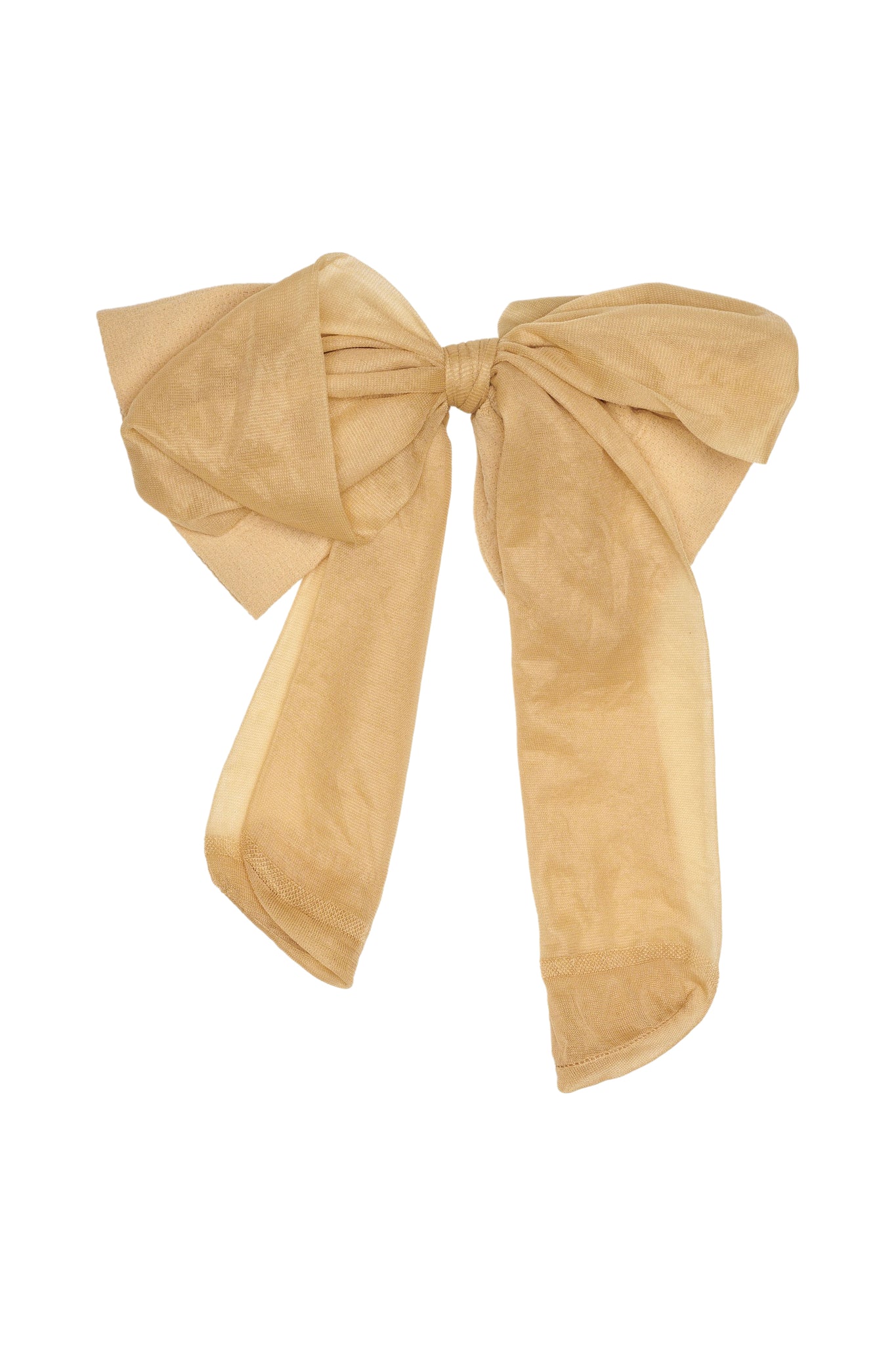 A hair clip featuring a bow made of pantyhose, hand stitched on
