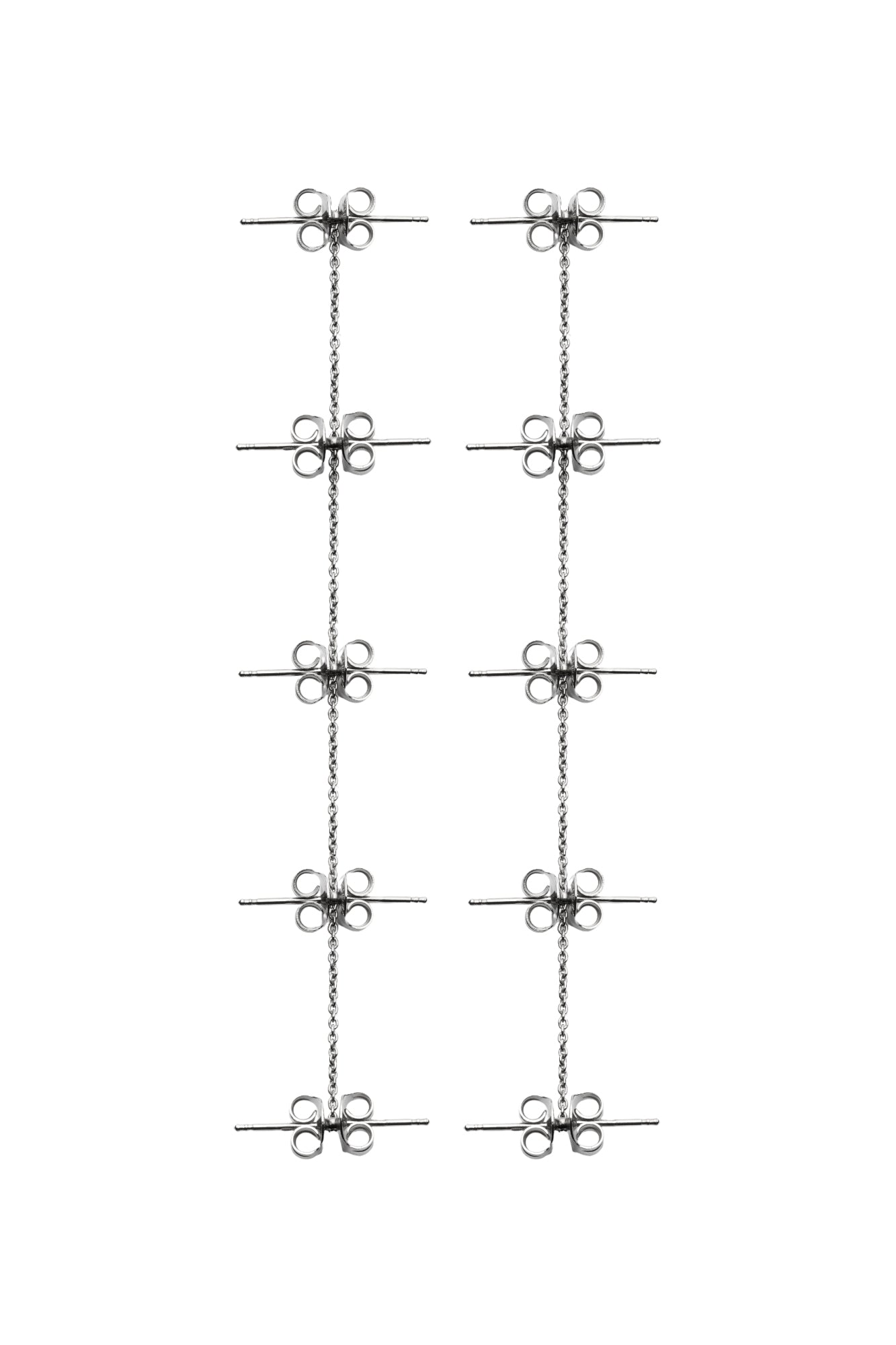 A pair of dangling earrings featuring multiple posts with branded backings, allowing you to wear them in different ways.
